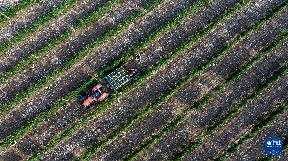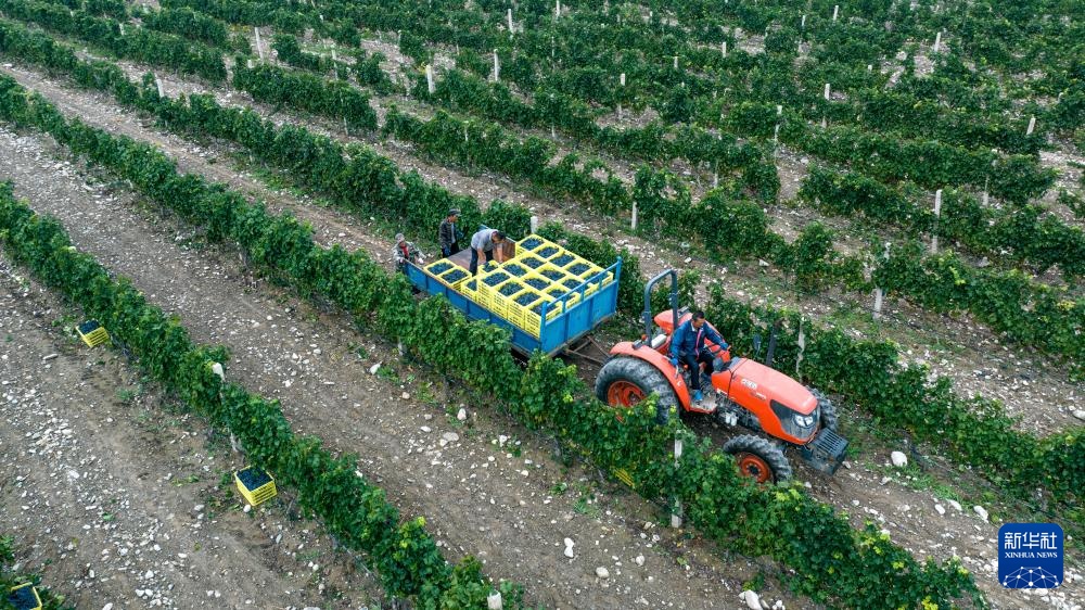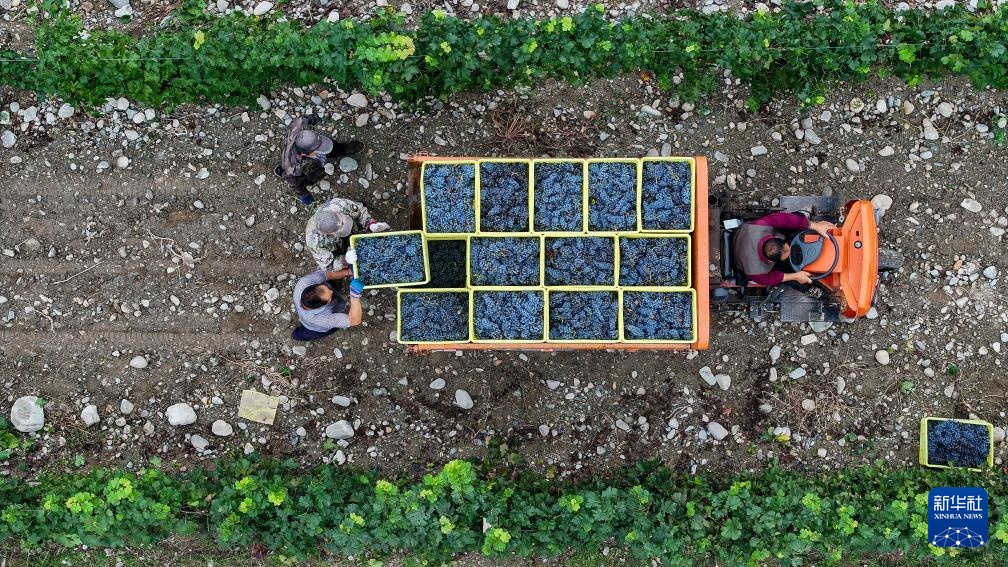 9月19日,工人在宁夏沃尔丰酿酒葡萄种植基地转运采摘下的酿酒葡萄(无人机照片)。