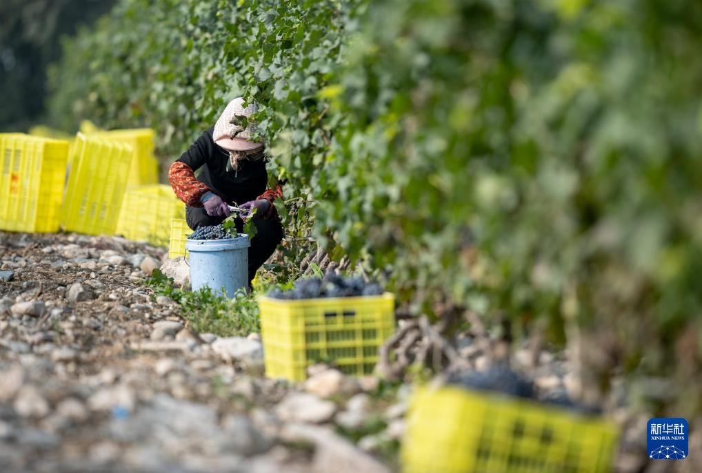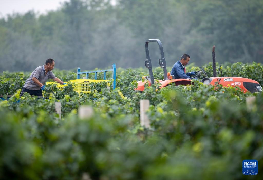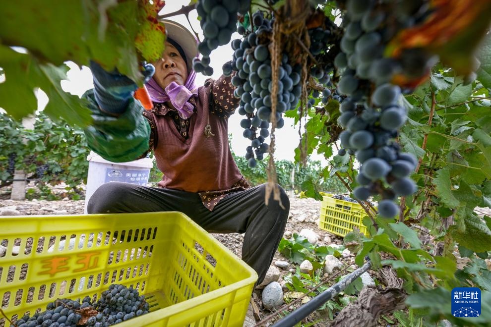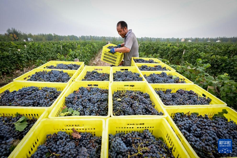 9月19日,工人在宁夏沃尔丰酿酒葡萄种植基地采摘酿酒葡萄。