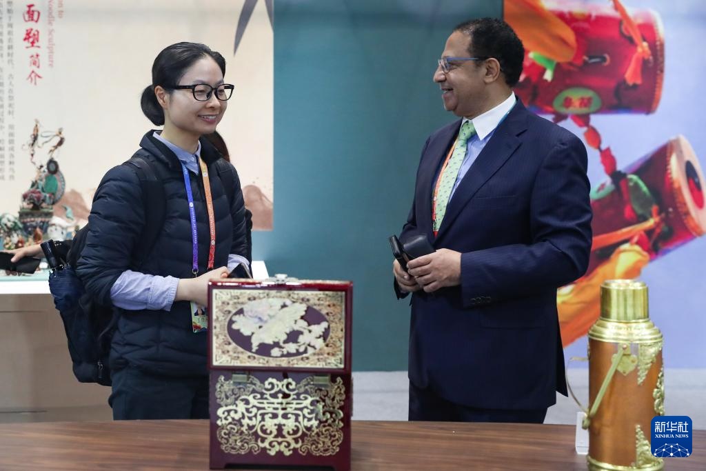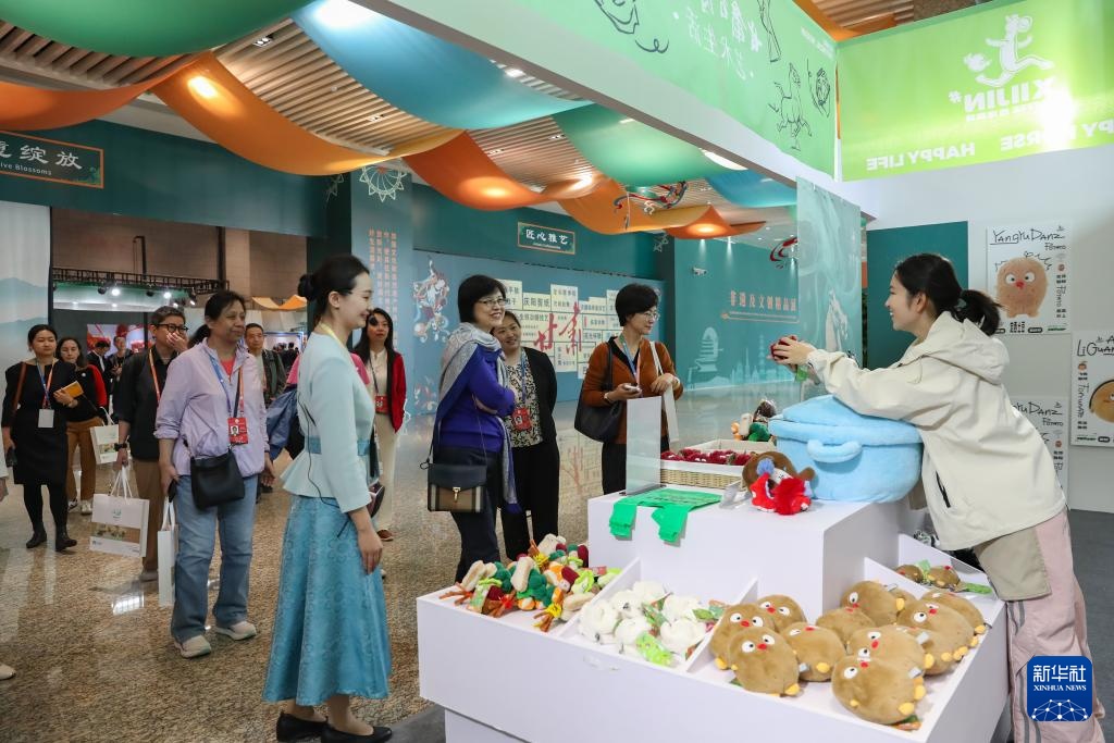 9月21日,与会嘉宾在第七届丝绸之路(敦煌)国际文化博览会上参观非遗及文创精品展。