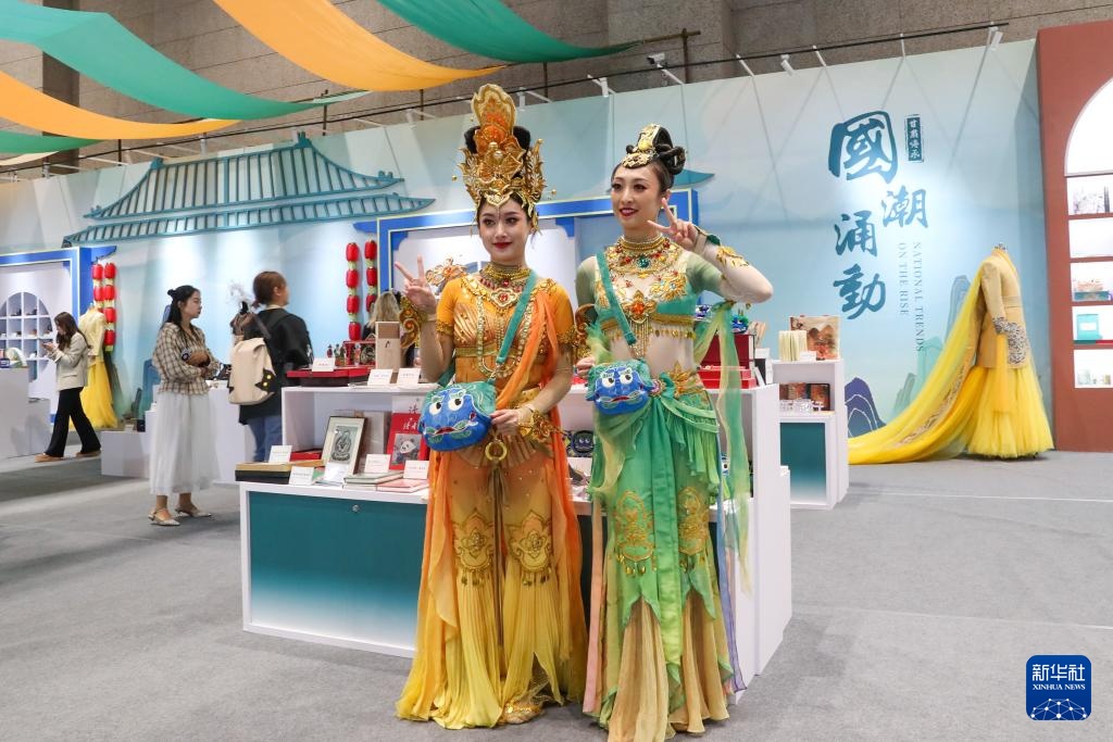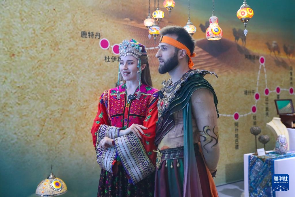 9月21日,演职人员在第七届丝绸之路(敦煌)国际文化博览会上参观非遗及文创精品展并拍照留念。