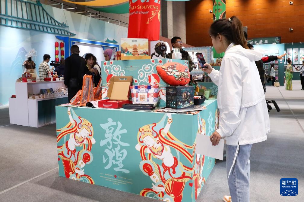 9月21日,媒体工作者在第七届丝绸之路(敦煌)国际文化博览会上拍摄非遗及文创精品展。