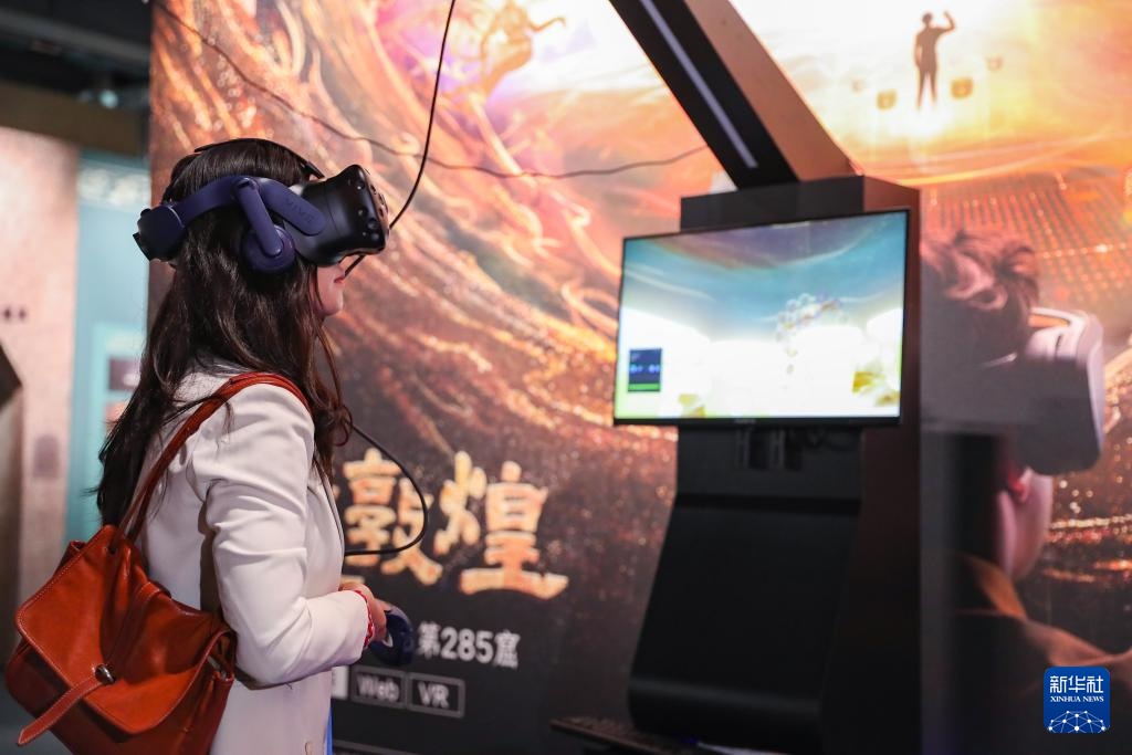 9月21日,在第七届丝绸之路(敦煌)国际文化博览会上,与会嘉宾借助VR设备沉浸式游览莫高窟虚拟场景。