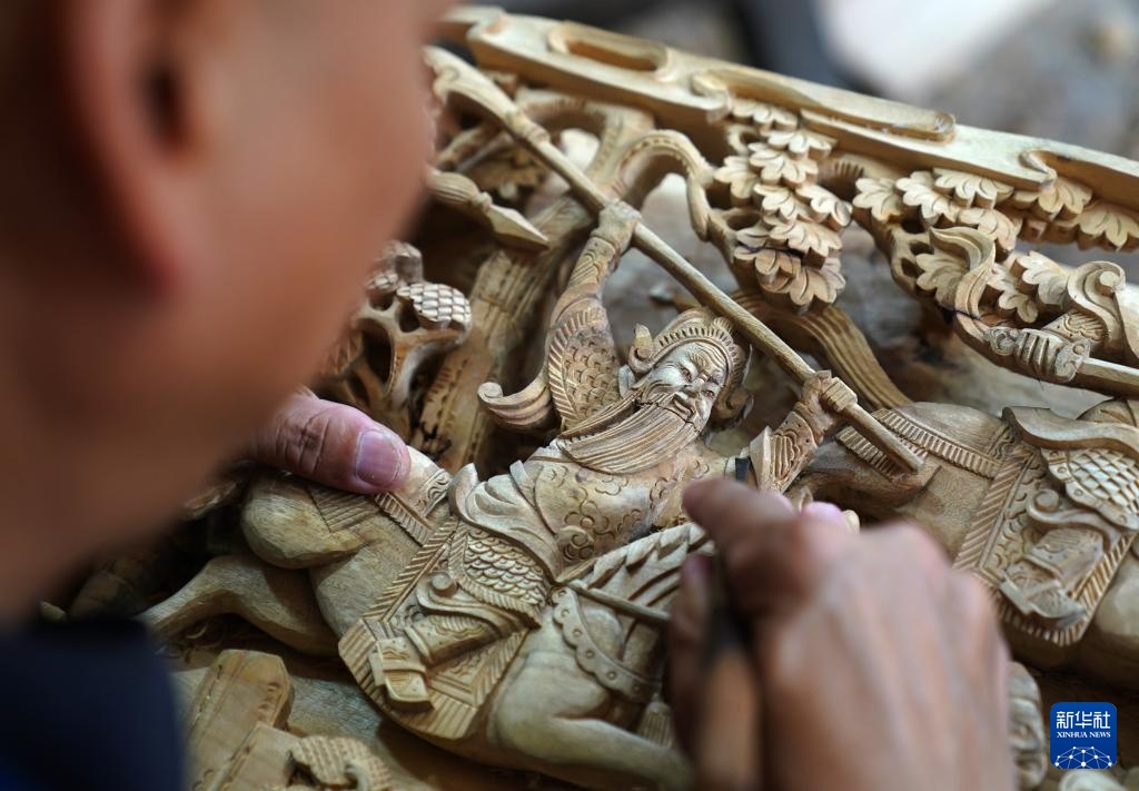 在江西省婺源县江湾镇汪口村,俞友鸿在雕刻“三国”题材的木雕作品(9月20日摄)。