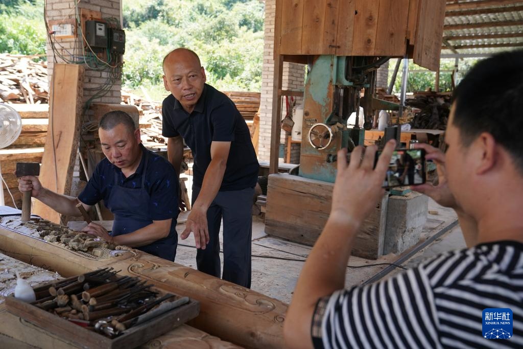 为在互联网平台上传播中国传统非遗技艺,俞友鸿(中)在雕刻厂内录制婺源三雕的相关短视频(9月20日摄)。