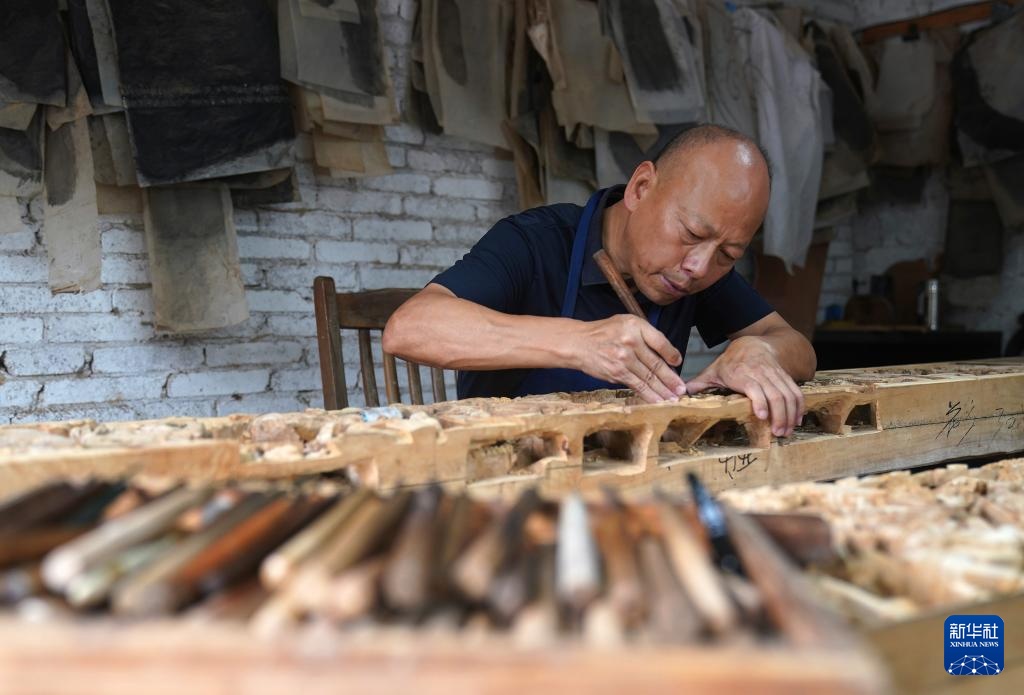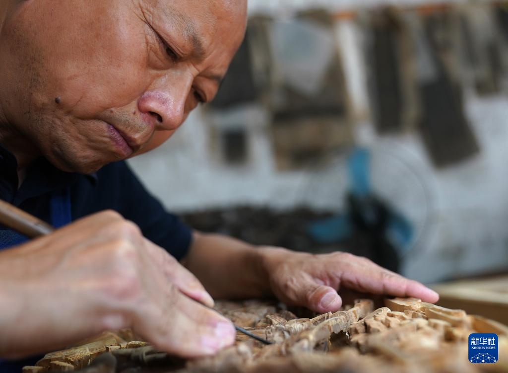在江西省婺源县江湾镇汪口村,“婺源三雕”国家级非物质文化遗产代表性传承人俞友鸿正在雕刻一件木雕作品(9月20日摄)。
