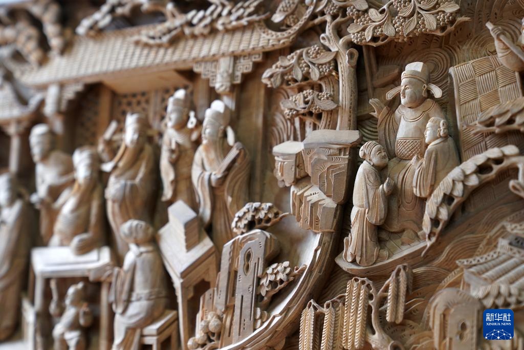 这是木雕作品《以文会友》的一处细节(9月20日摄)。