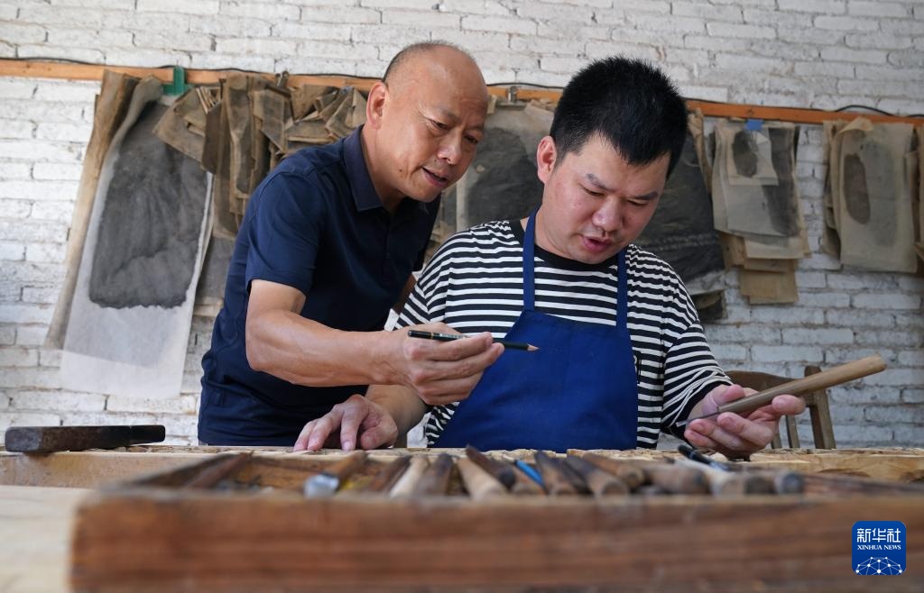 俞友鸿(左)在教授徒弟雕刻技艺(9月20日摄)。