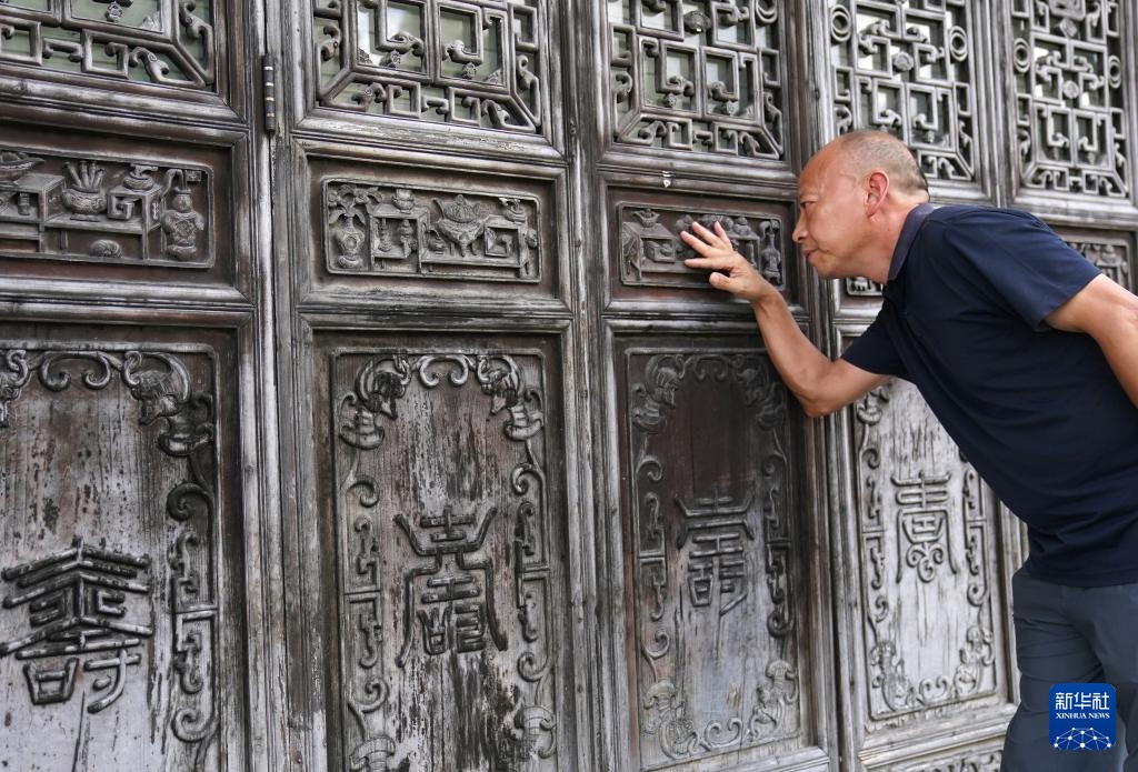 在江西省婺源县江湾镇汪口村,俞友鸿在查看一处民居建筑上的木雕作品(9月20日摄)。