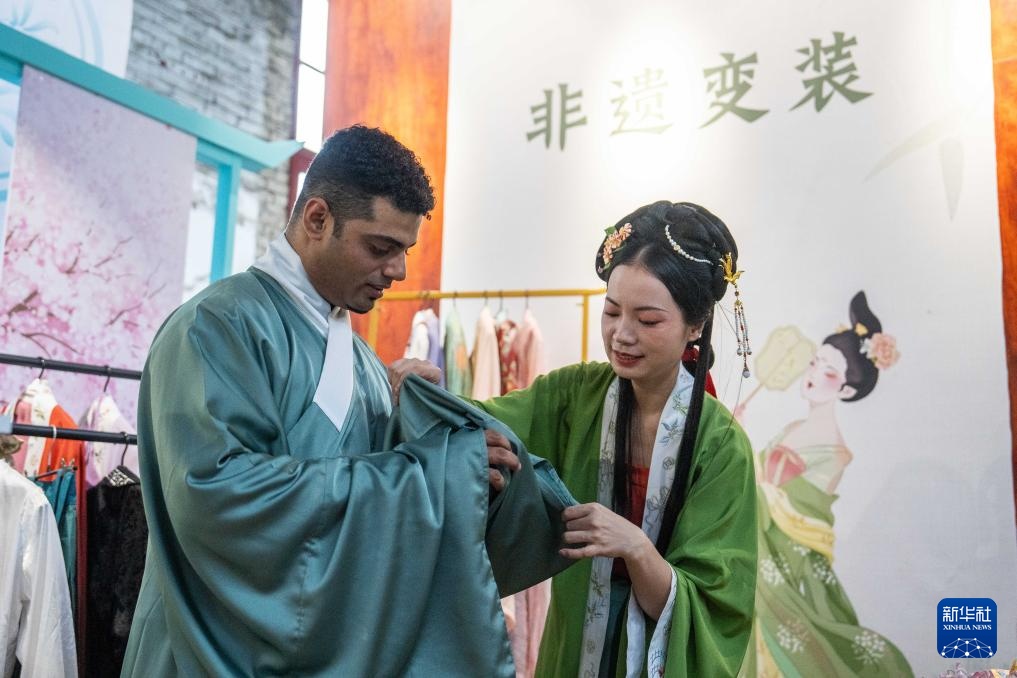 9月21日,在第三届湖南非遗博览会上,观众(左)在体验传统服饰。