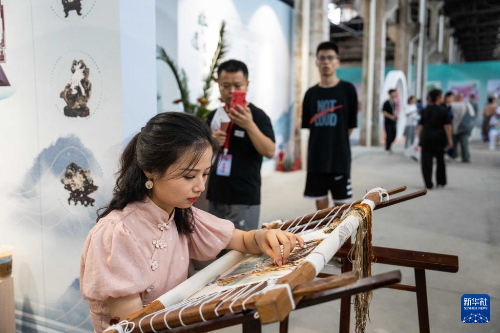 9月21日,在第三届湖南非遗博览会上,参展商在演示麻质画制作。