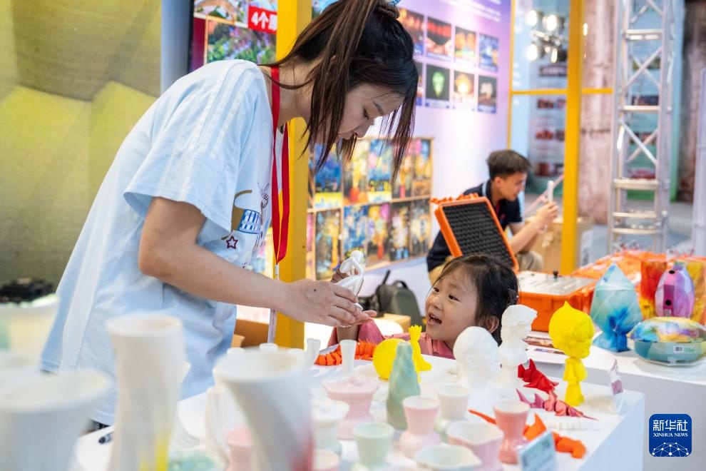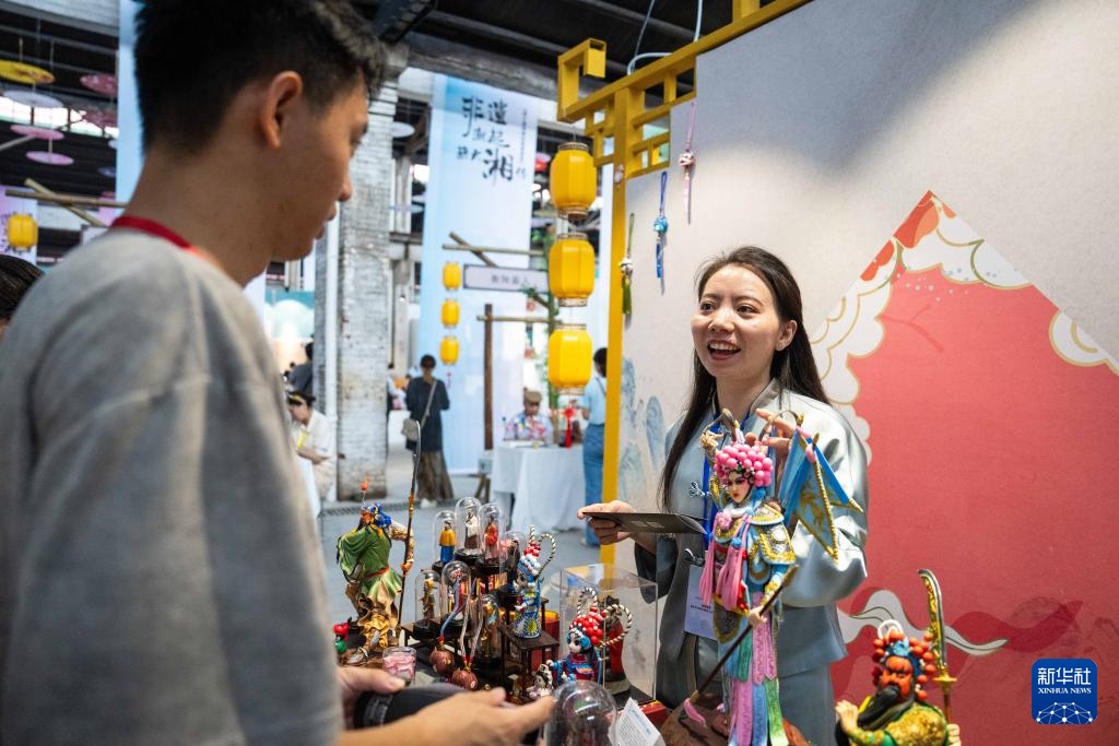 9月21日,在第三届湖南非遗博览会上,参展商(左)向观众介绍3D打印非遗文创产品。