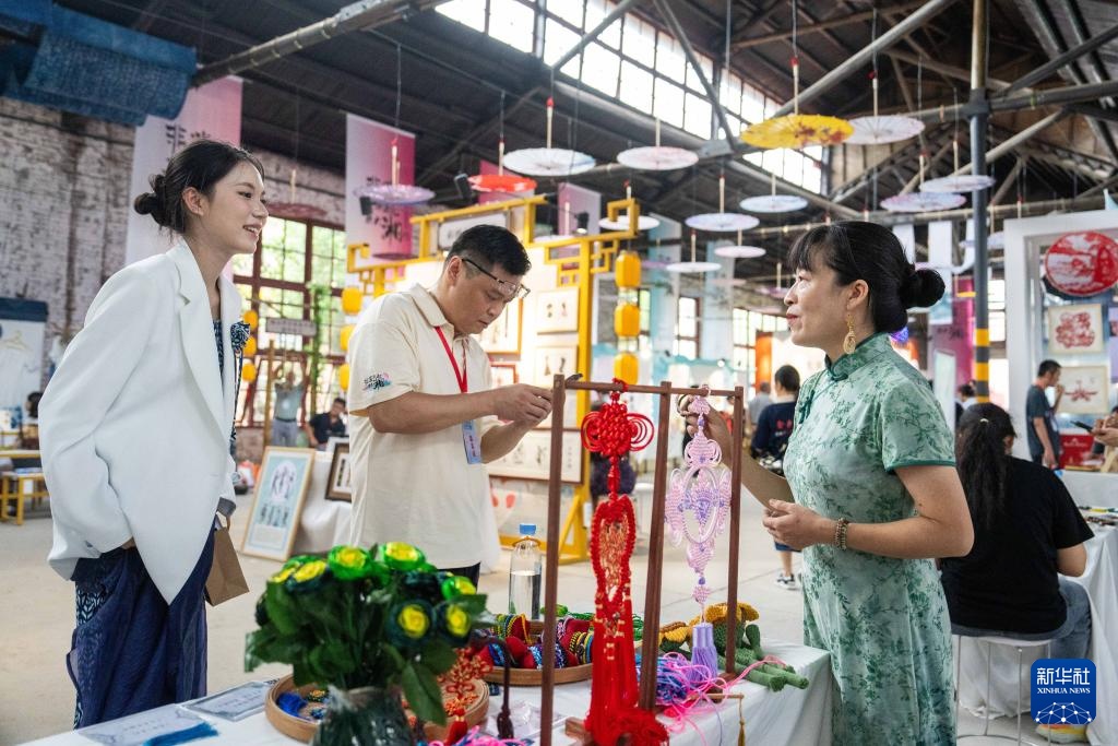 9月21日,在第三届湖南非遗博览会上,参展商(前右)向观众介绍中国结。