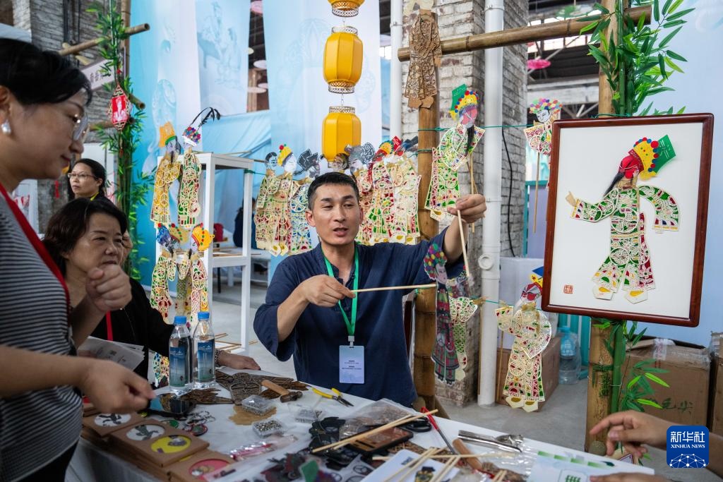 9月21日,在第三届湖南非遗博览会上,参展商(右)向观众介绍纸影制作技艺。