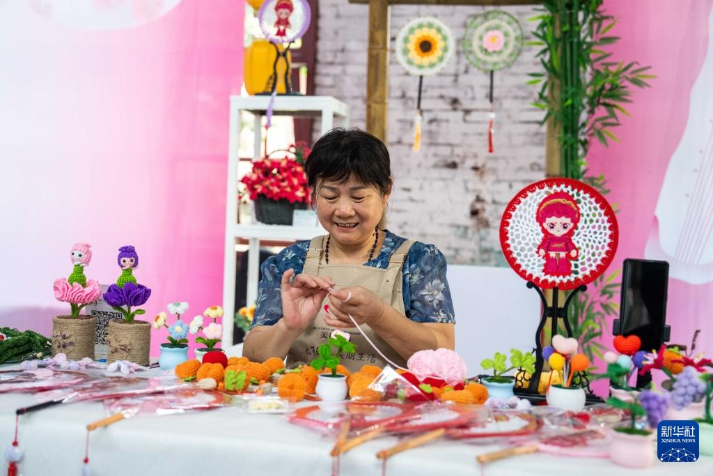 9月21日,在第三届湖南非遗博览会上,参展商在演示手工针织技艺。