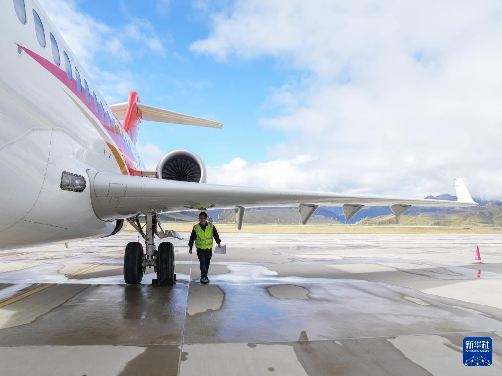 9月21日,在青海果洛玛沁机场,机务人员在对国产商用飞机ARJ21进行短停检查。
