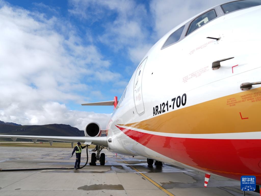 9月21日,在青海果洛玛沁机场,工作人员在为国产商用飞机ARJ21加油。