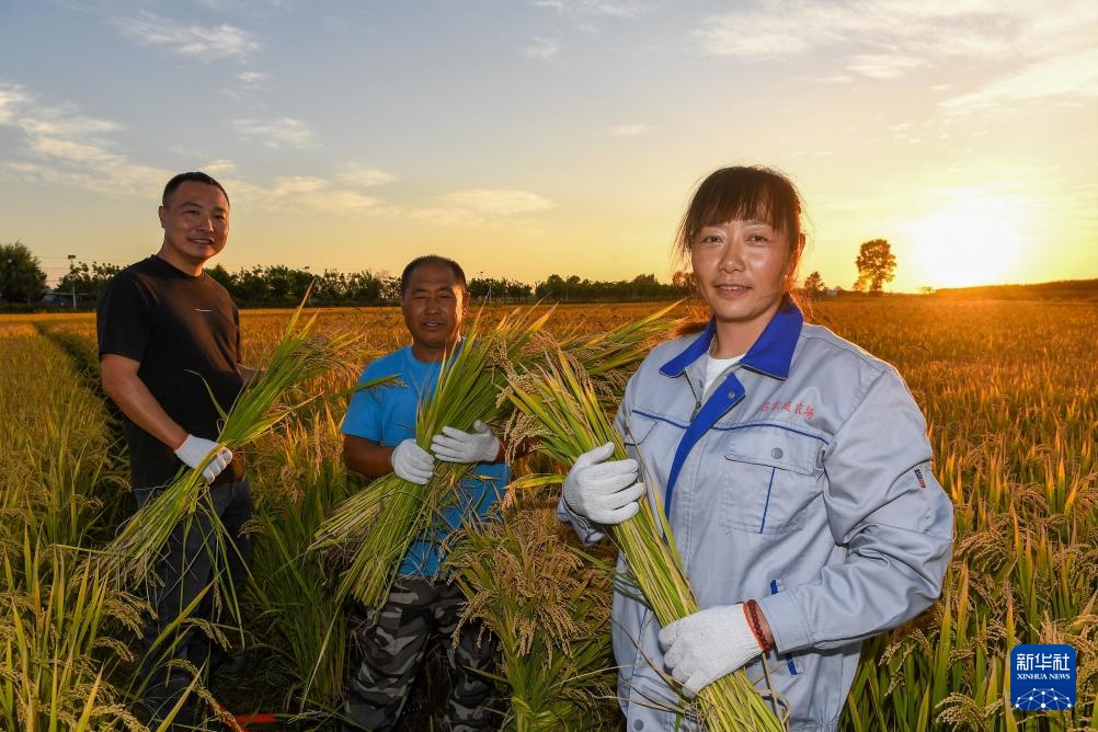 9月20日,在位于吉林省永吉县万昌镇的永吉县禾谷丰水稻种植农民专业合作社,负责人张帅(左一)和两位农民手捧收获的水稻。