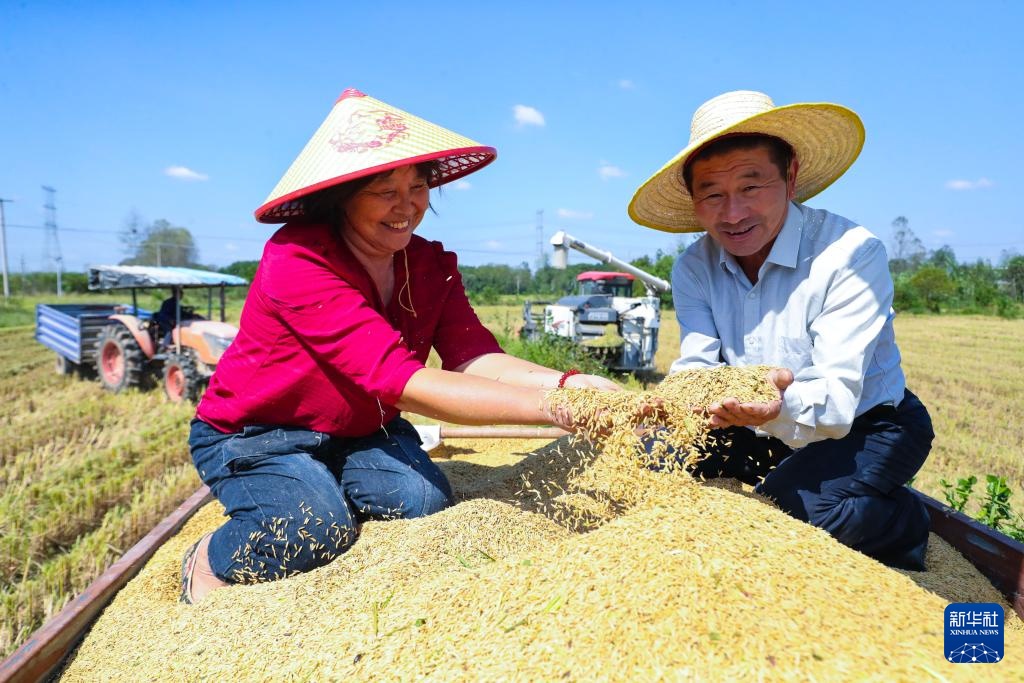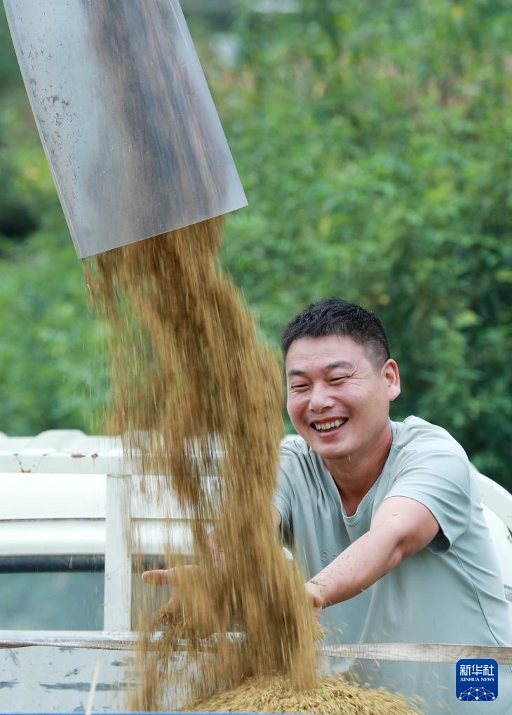 9月22日,在湖北省秭归县九畹溪镇石柱村,村民在查看刚收割的冷水稻谷。