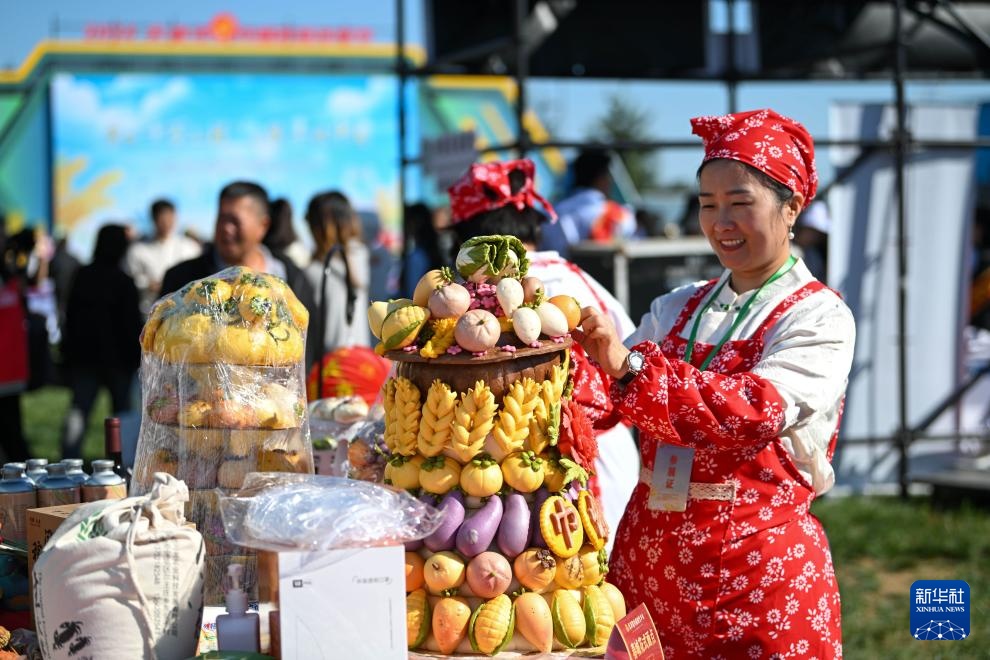 9月22日,在天津市武清区南蔡村镇天民田园,工作人员摆放庆丰收为主题的面食作品。