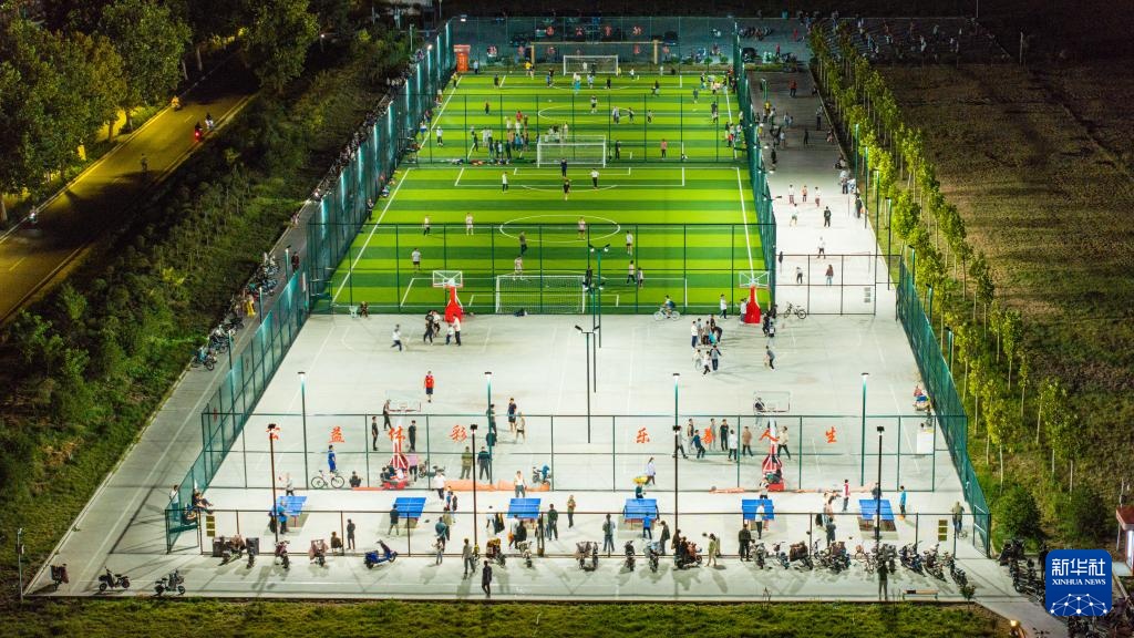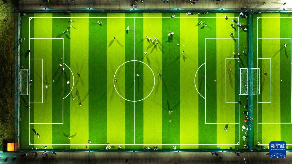 9月21日,居民们在宁阳县城区一处体育公园内踢足球(无人机照片)。