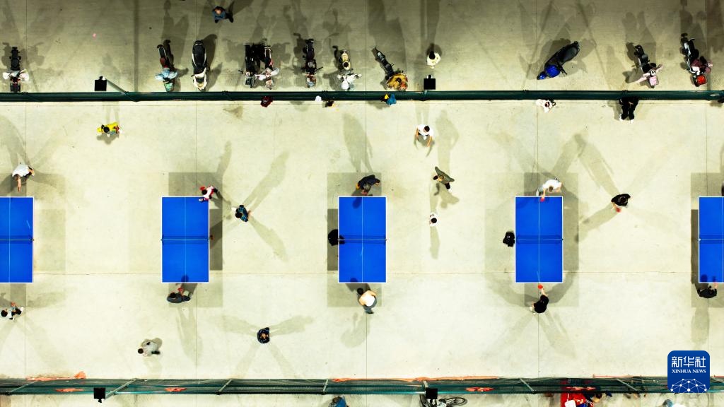9月21日,居民们在宁阳县城区一处体育公园内打乒乓球(无人机照片)。