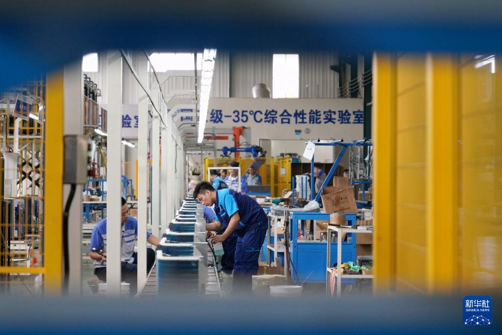 9月21日,工人在山东中科蓝天科技有限公司全自动智能生产线组装空气能热泵。