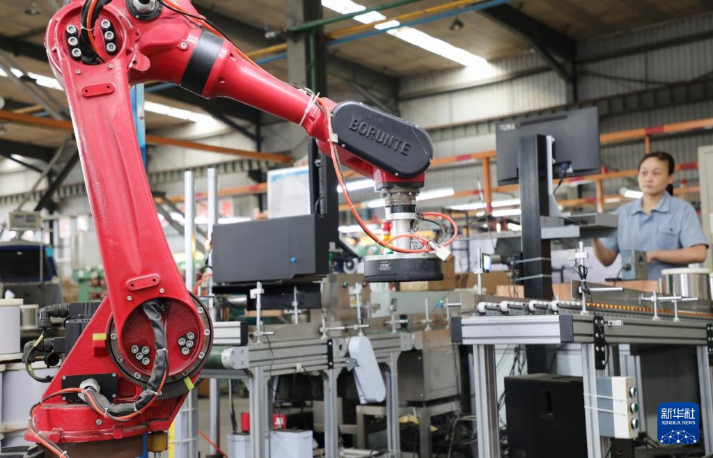 9月21日,在山东腾达不锈钢制品有限公司,员工操作机械臂对塑轴进行包装。