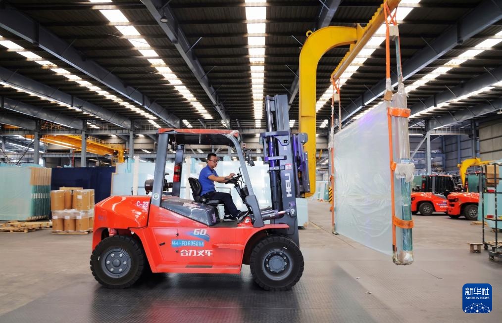 9月21日,在山东金晶玻璃有限公司,员工在成品库驾驶叉车将玻璃原片进行入库操作。