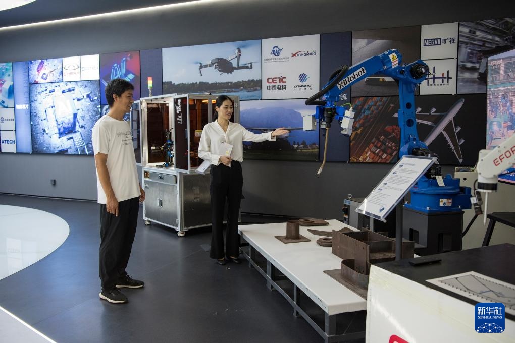 9月20日,在位于安徽省芜湖市的“中国视谷”展厅,工作人员为参观者介绍一款智能焊接机器人。