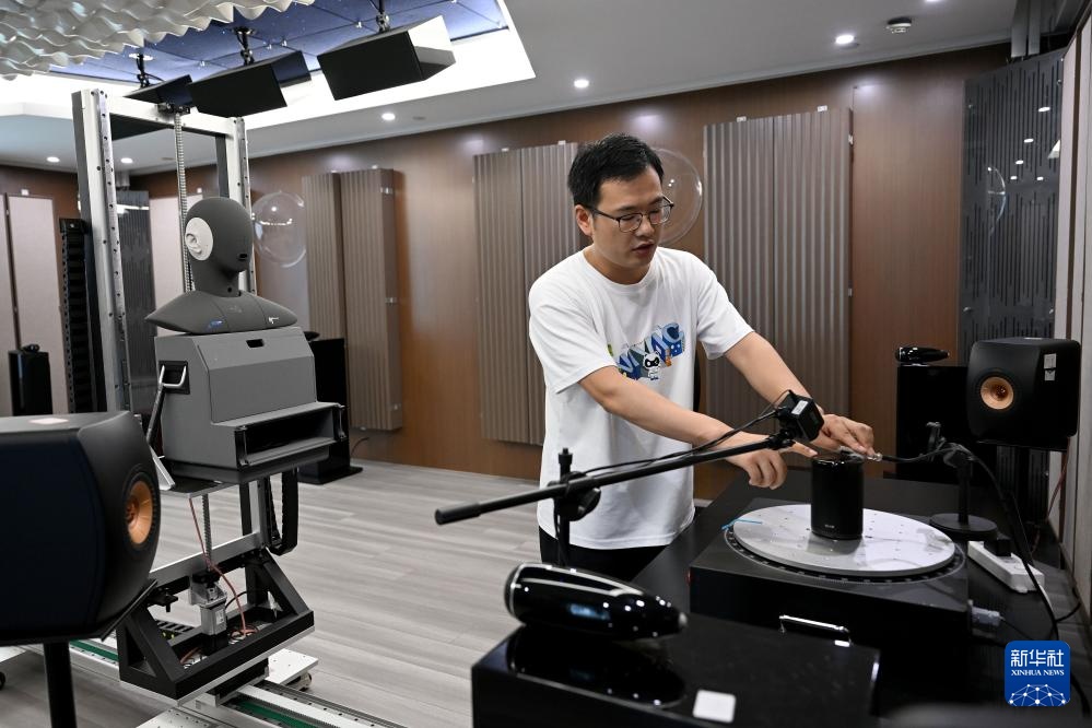 9月20日,在位于安徽省合肥市的“中国声谷”国家智能语音创新中心,工作人员在可调混响实验室对一款智能音箱进行检测。