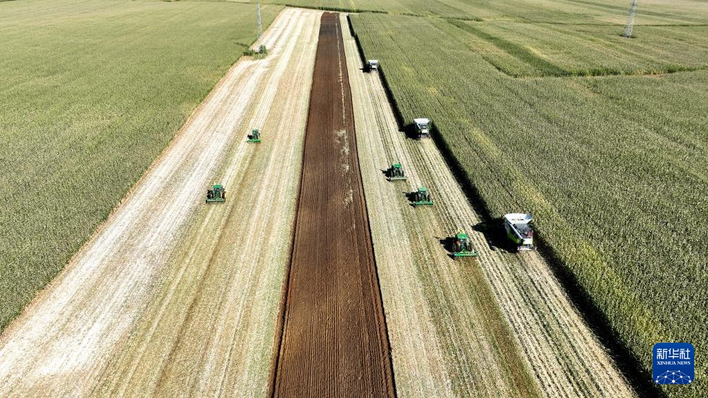 9月22日,在由北大荒集团黑龙江共青农场有限公司全程托管的黑龙江省鹤岗市萝北县良种场玉米地块,大型作业机车在进行收获、打茬作业(无人机照片)。