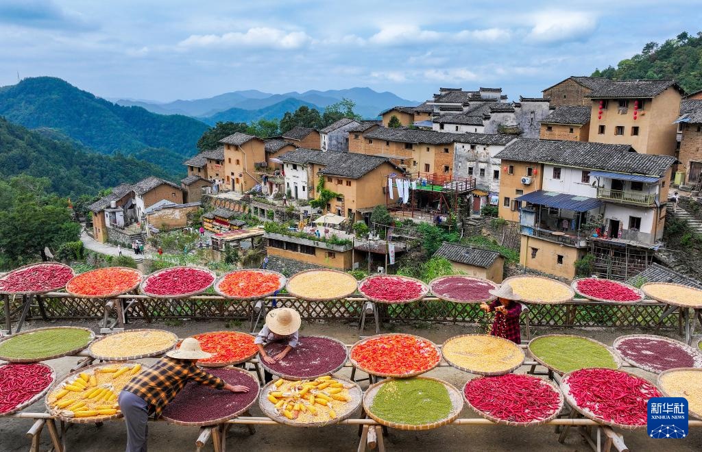 9月22日,在安徽省黄山市歙县阳产村,村民在土楼前晾晒农作物(无人机照片)。