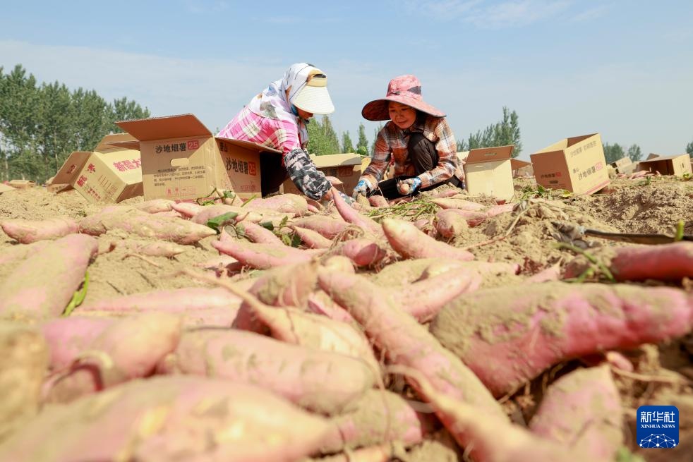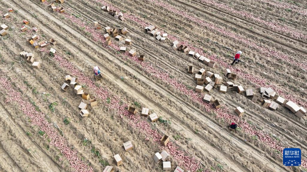 9月22日,河北省唐山市丰南区大新庄镇柳林三村的农民在田间收获红薯。