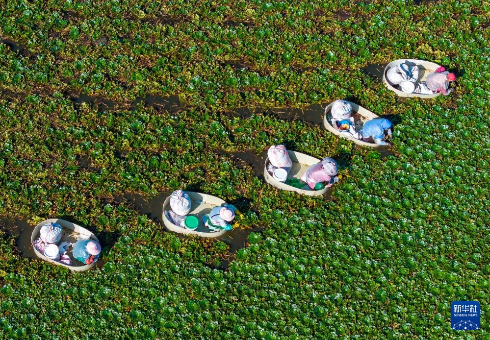 9月22日,农民在江苏省泰州市海陵区苏陈镇张家院社区采摘菱角(无人机照片)。