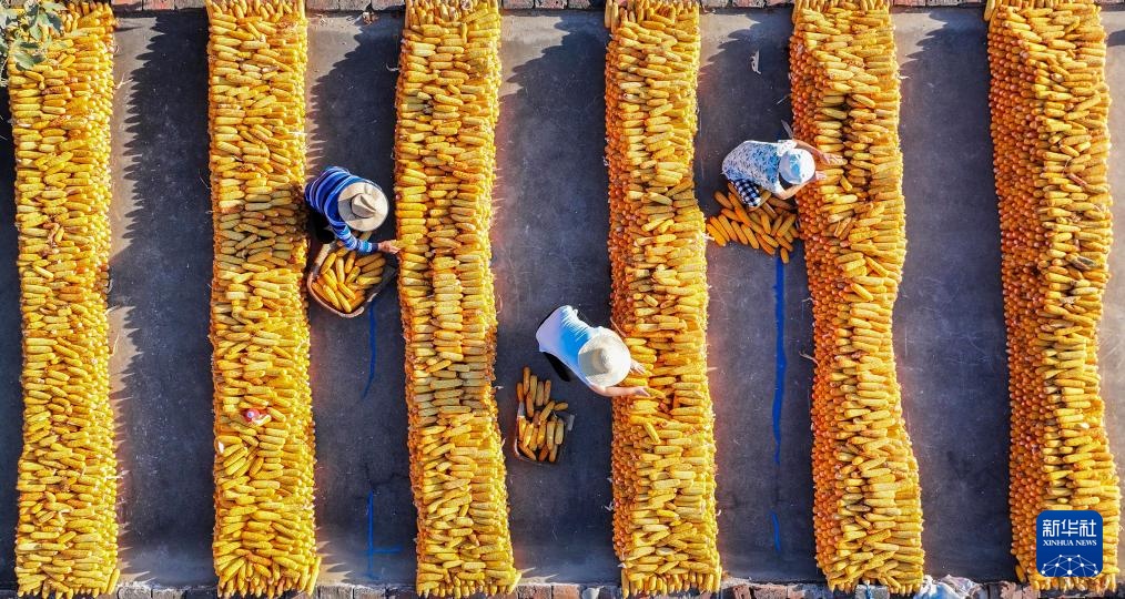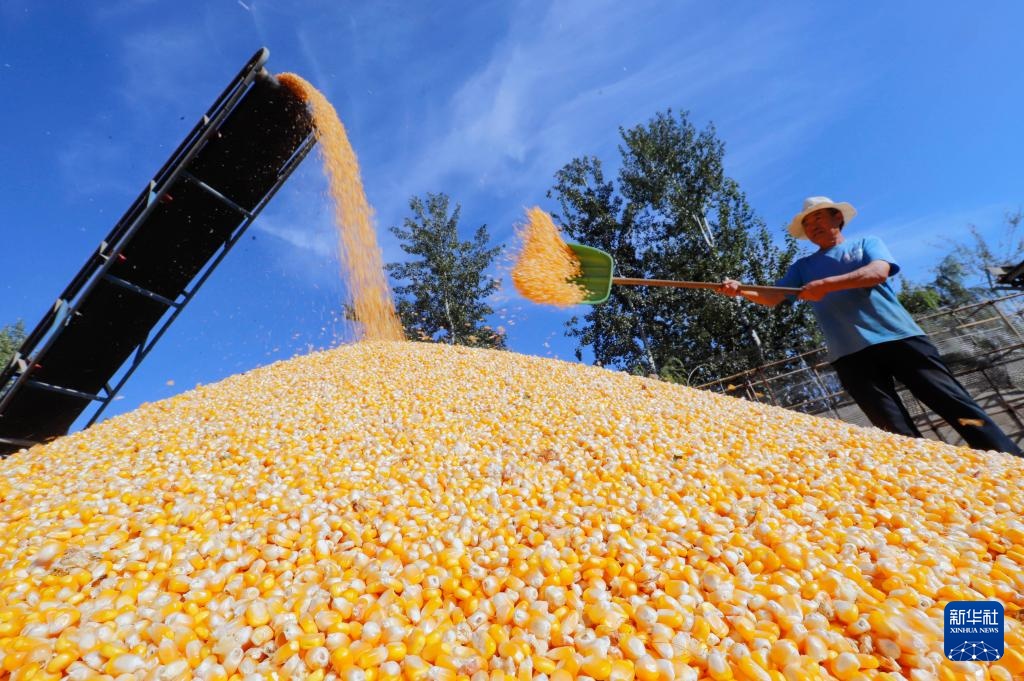 9月22日,河北省遵化市东新庄镇农民在场院晾晒玉米。