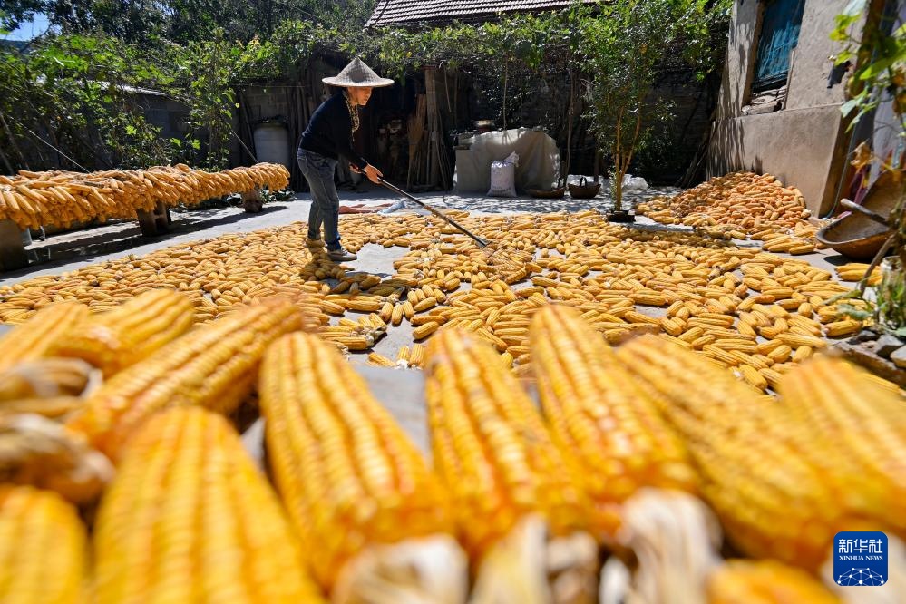 9月22日,山东省青州市庙子镇局子峪村农民在院子里晾晒玉米。