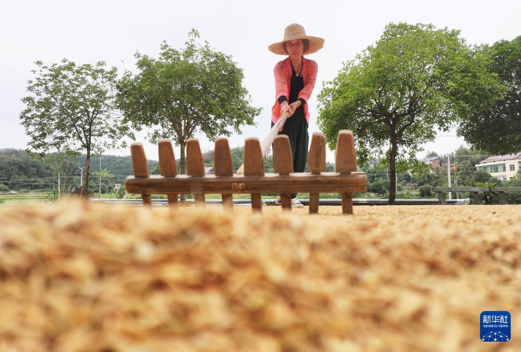 9月22日,湖南省衡阳市衡山县开云镇村民在晾晒稻谷(无人机照片)。