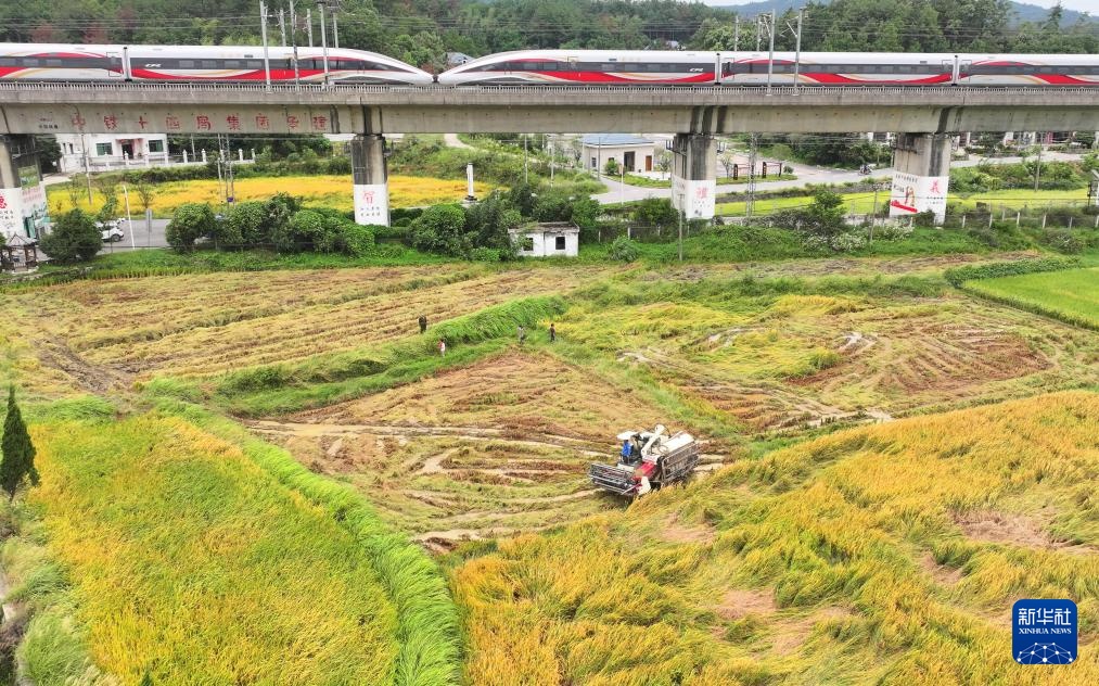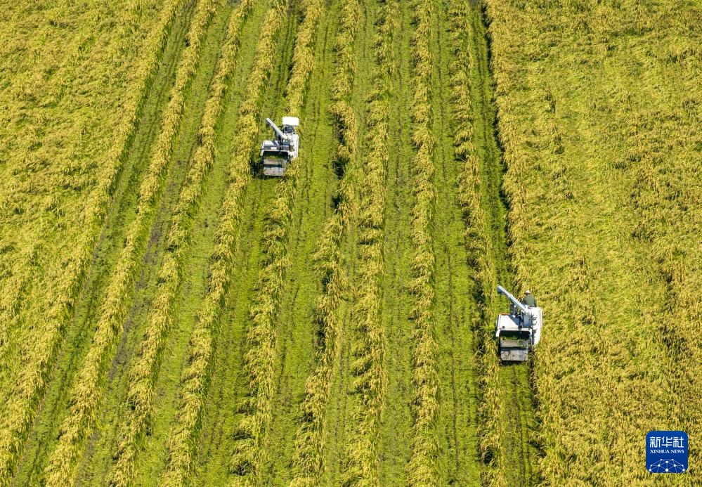 9月22日,在湖南省衡阳市衡山县开云镇,村民驾驶农机在收割稻谷(无人机照片)。