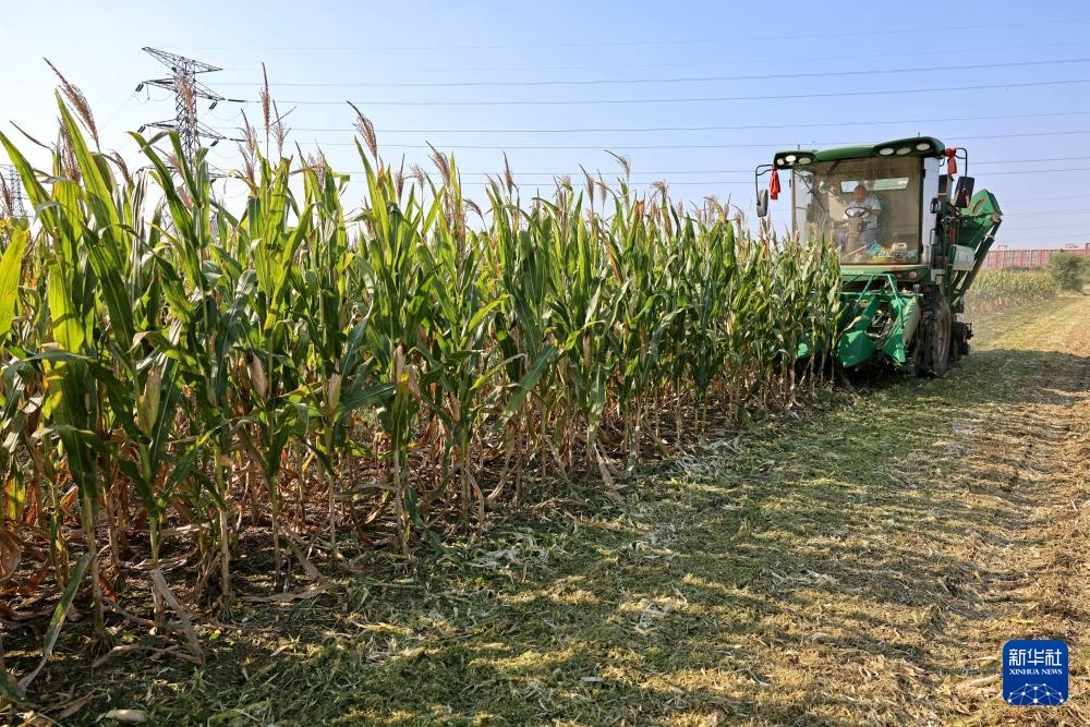 9月22日,在山东省枣庄市西王庄镇石羊村,农机手驾驶联合收割机在田间收获玉米。