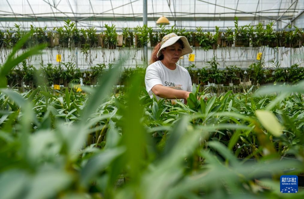 9月22日,一名工作人员在龙陵县石斛花卉交易展示中心为石斛除草。
