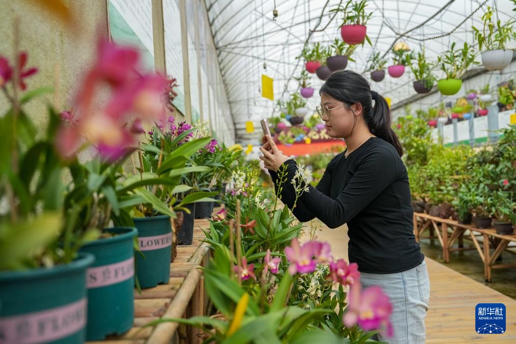 9月22日,一名游客在龙陵县石斛花卉交易展示中心拍摄石斛花。