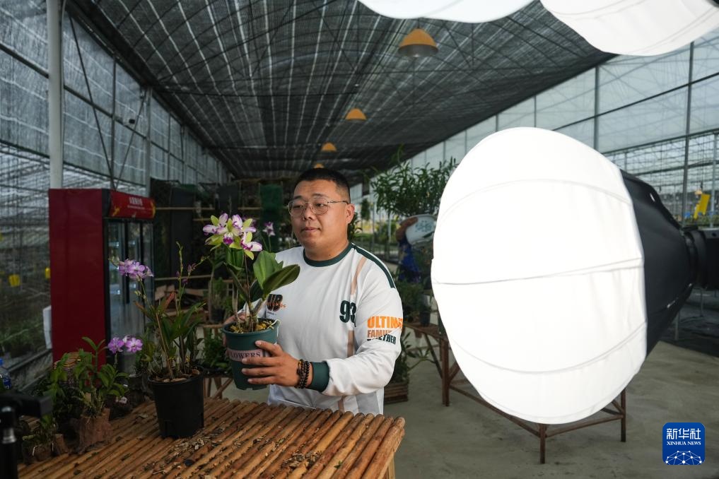 9月22日,一名主播在龙陵县石斛花卉交易展示中心直播售卖石斛花。