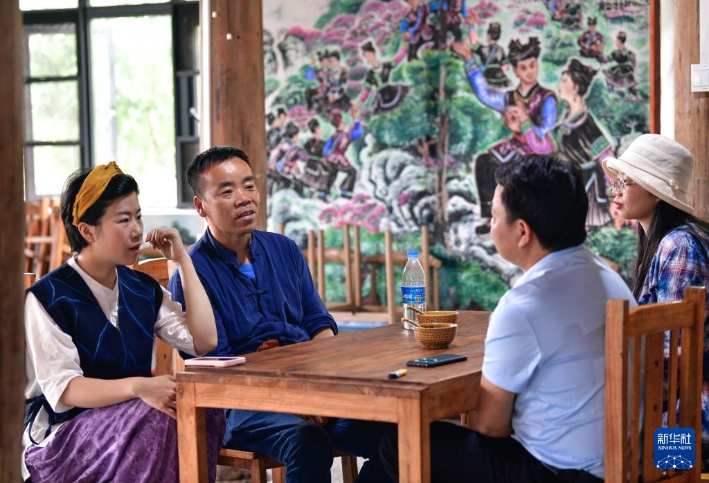 在贵州省黎平县尚重镇洋洞村,杨正熙(左二)向文艺工作者介绍“牛耕部落”整体情况(5月19日摄)。
