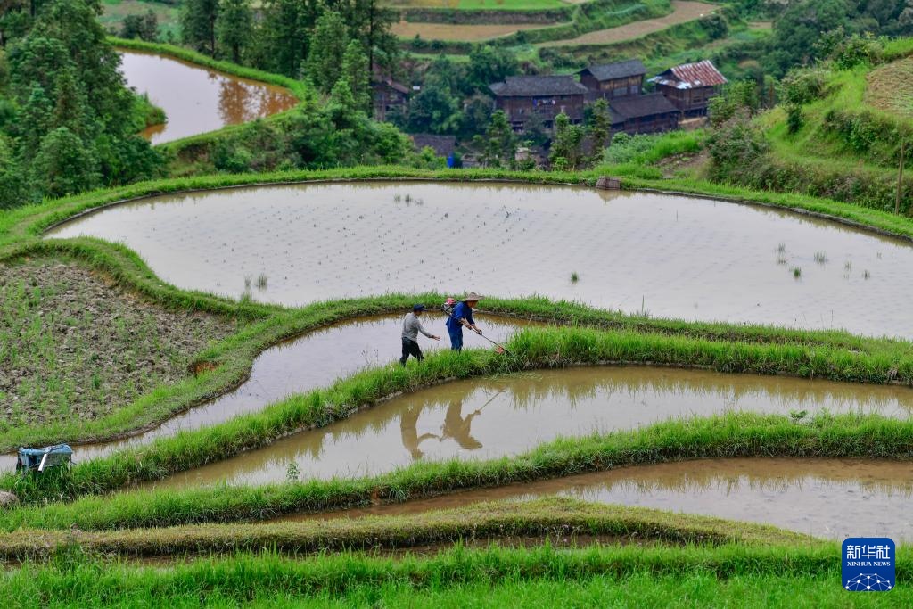 杨正熙在贵州省黎平县尚重镇洋洞村的梯田上帮助村民耕田(5月19日摄)。