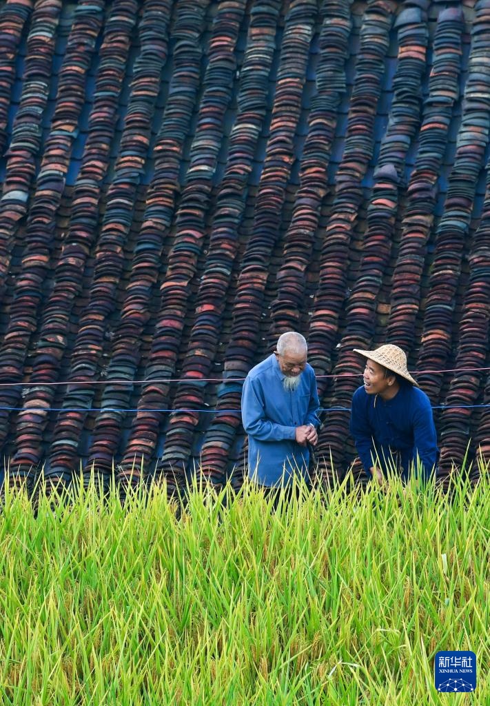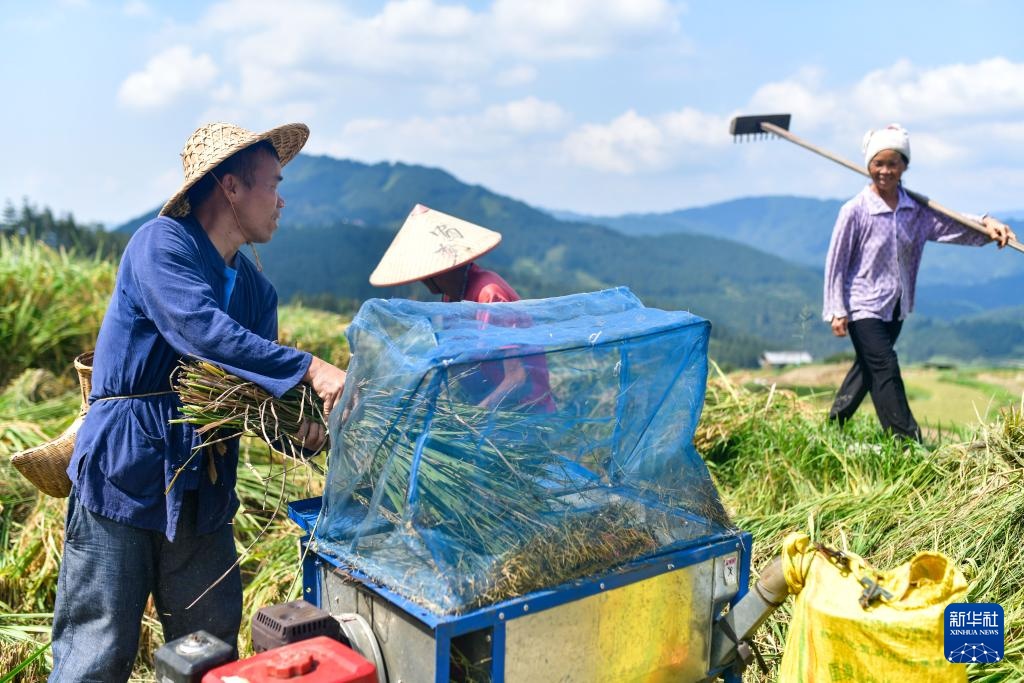 杨正熙(左)在贵州省黎平县尚重镇洋洞村的梯田上帮助村民晾晒稻谷(9月19日摄)。