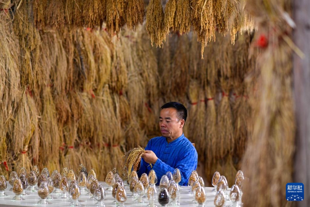 杨正熙在贵州省黎平县尚重镇洋洞村的种子博物馆里整理水稻老品种(5月18日摄)。