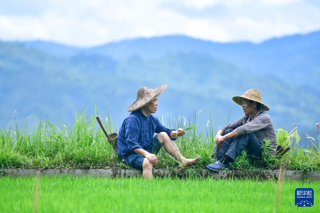 在贵州省黎平县尚重镇洋洞村,杨正熙(右)帮助村民在田埂上割草(5月19日摄)。