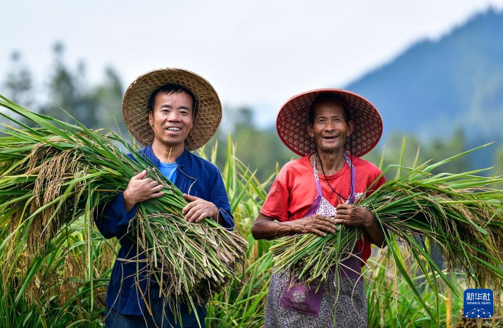 在贵州省黎平县尚重镇洋洞村,杨正熙(左)与村民展示收割的有机稻(9月19日摄)。