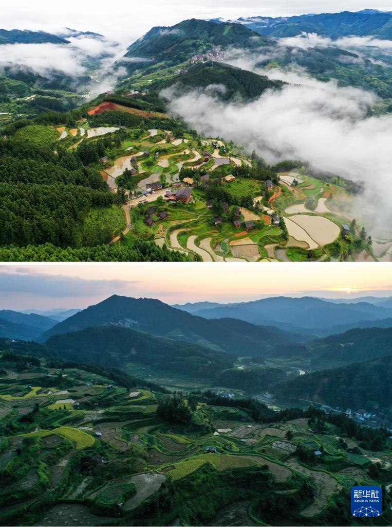 拼版照片:上图为5月19日拍摄的贵州省黎平县尚重镇洋洞村春耕时节的梯田(无人机照片);下图为9月18日拍摄的洋洞村秋收时节的梯田(无人机照片)。