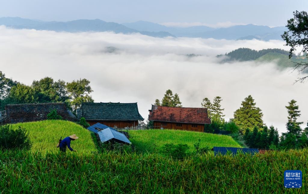 杨正熙在贵州省黎平县尚重镇洋洞村的梯田上查看水稻成熟情况(9月19日摄)。